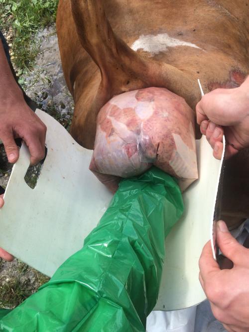 De dierenarts "pakt" de baarmoeder in, de veehouder assisteert en houdt de GYNbag vast.